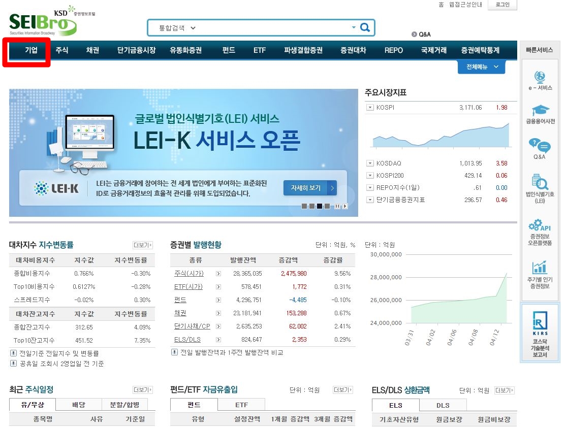 #1. 위 링크를 통해 한국예탁결제원에서 운영하는 세이브로 증권정보포털에 접속합니다. 상단의 '기업' 탭을 눌러주세요.
