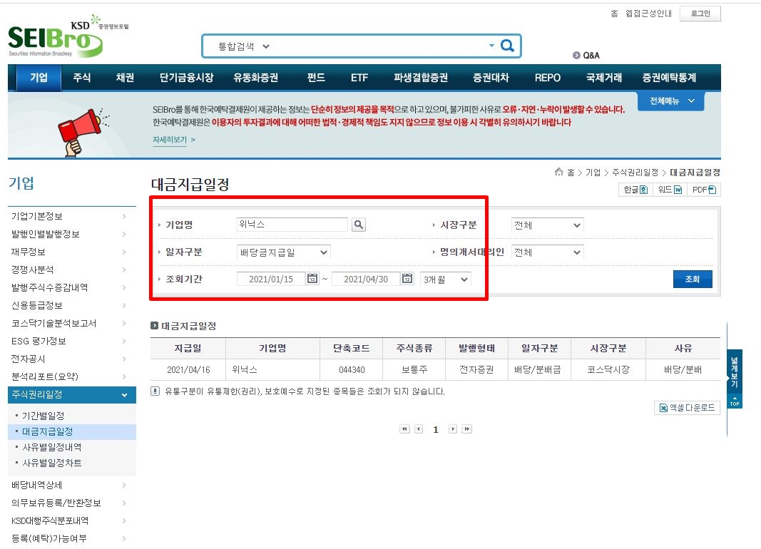 #3. 보유한 주식의 기업명을 검색하고 기간을 설정합니다. 제가 보유한 주식은 코스닥 상장기업인 위닉스 입니다. 배당금 지급일정을 확인해 보니 4/16에 들어온다고 명시돼 있네요. 오늘이 4/14이고 이틀 후면 제 증권사 계좌로 배당금이 입금이 되겠네요.