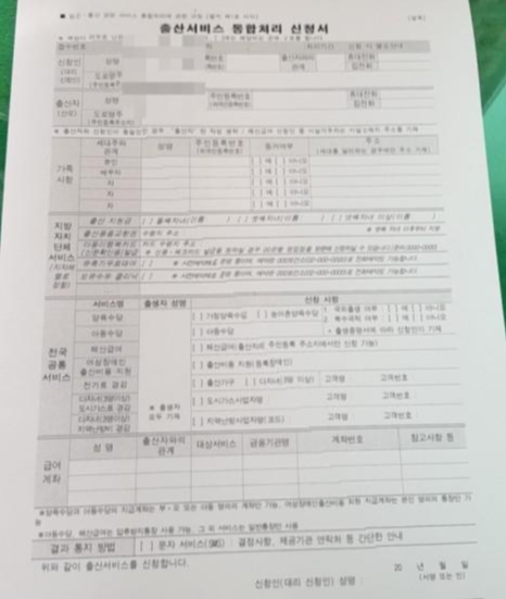 '출산서비스 통합처리신청서' 라는 양식을 작성하면