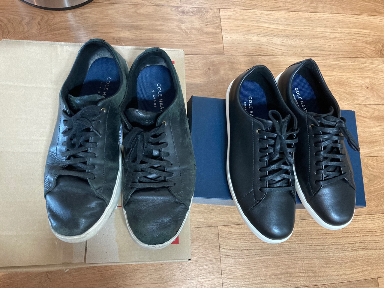 마지막으로 약 2년 가까이 신었던 동일한 모델의 신발과 새신발을 비교해 보았습니다. 착화감이 좋아 자주 신었던 만큼 가죽도 낡고 헤지고 했네요. 직장인 비즈니스 캐쥬얼화로 추천드립니다!