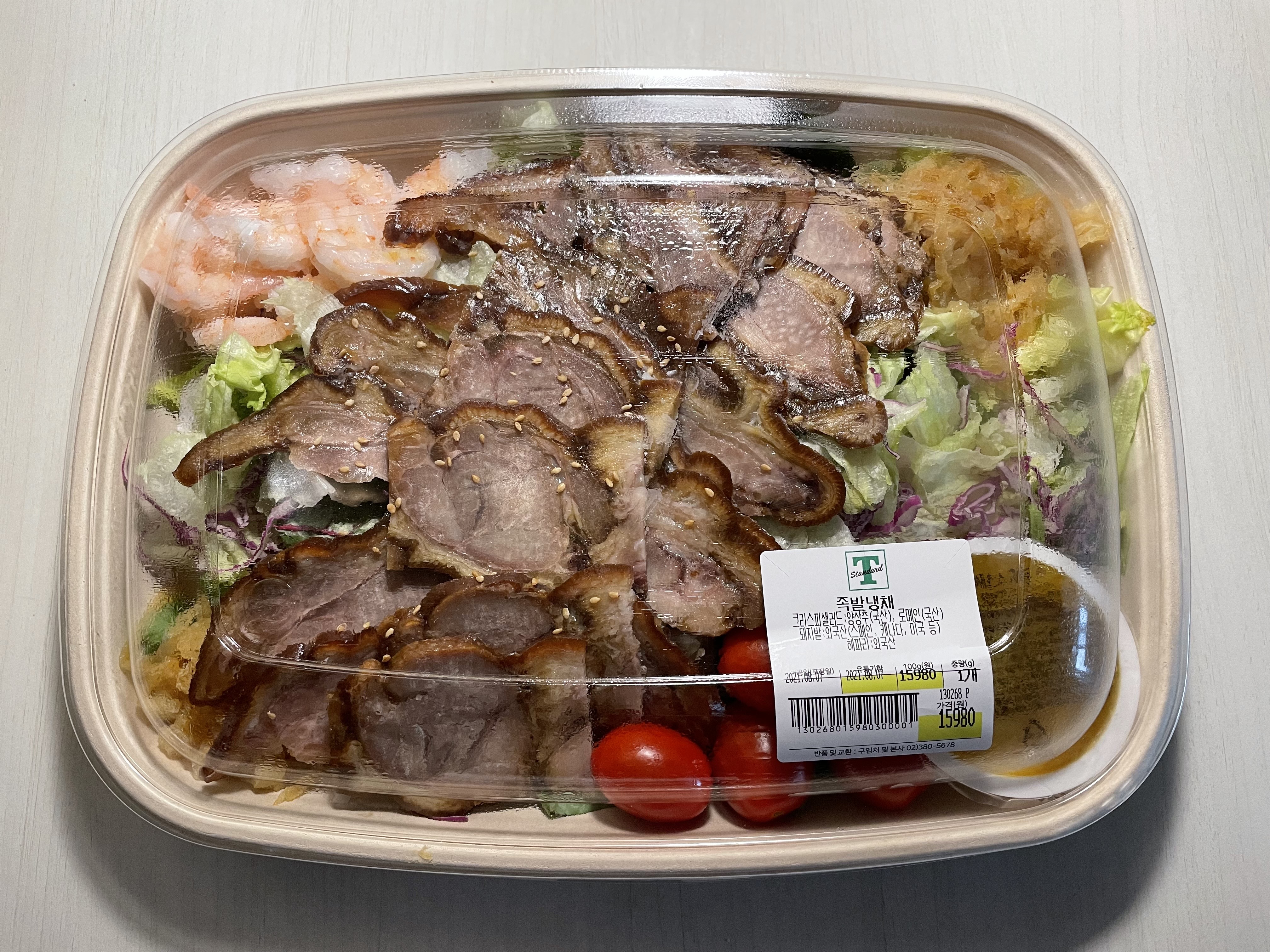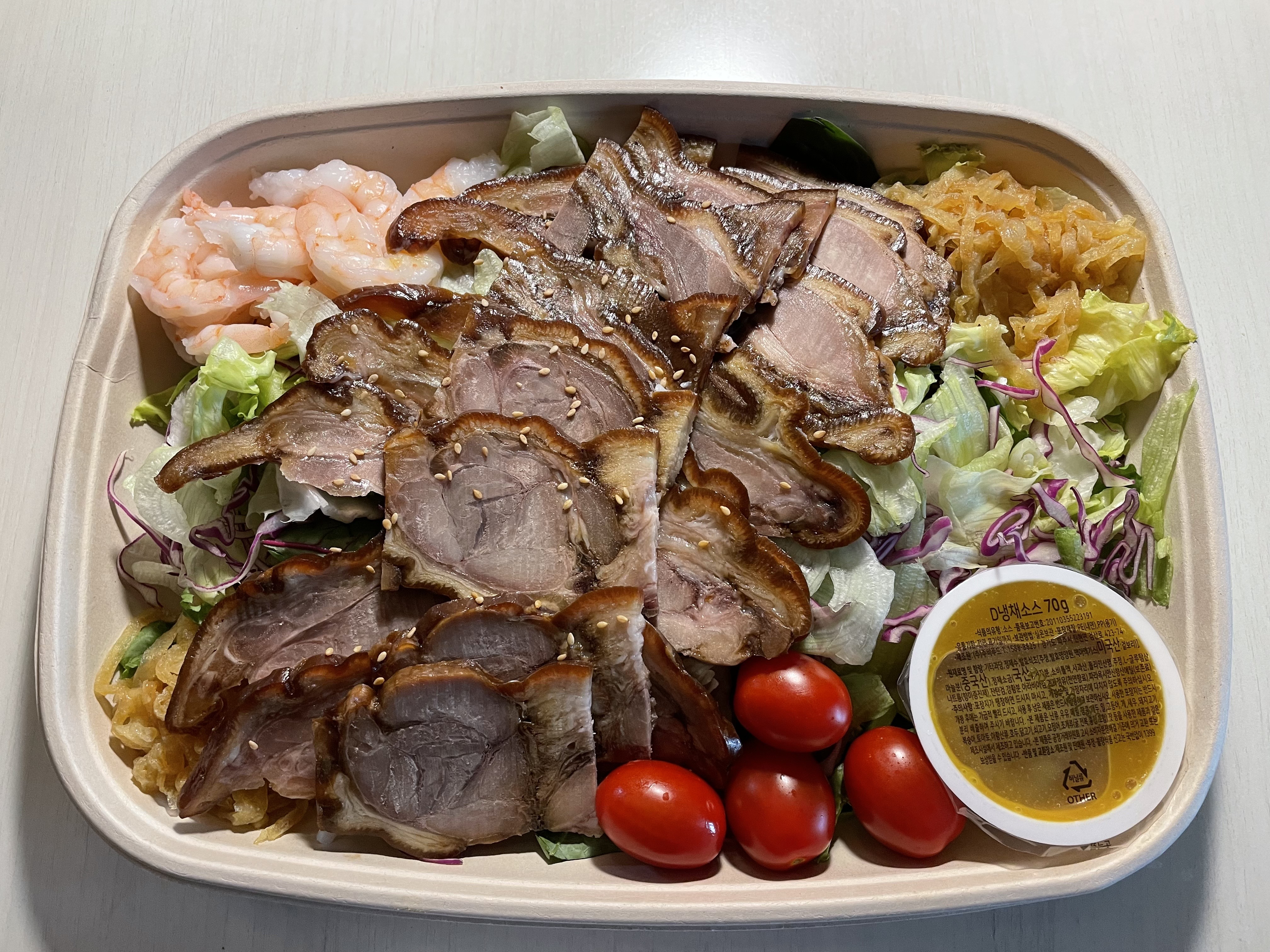 족발 외에도 새우, 해파리가 들어 있구요 양상추, 방울토마토, 양배추, 파프리카 채소가 듬뿍 들어있습니다. 채소 + 단백한 고기 조합이라 다이어트 하시는 분들에게도 좋을 것 같네요.