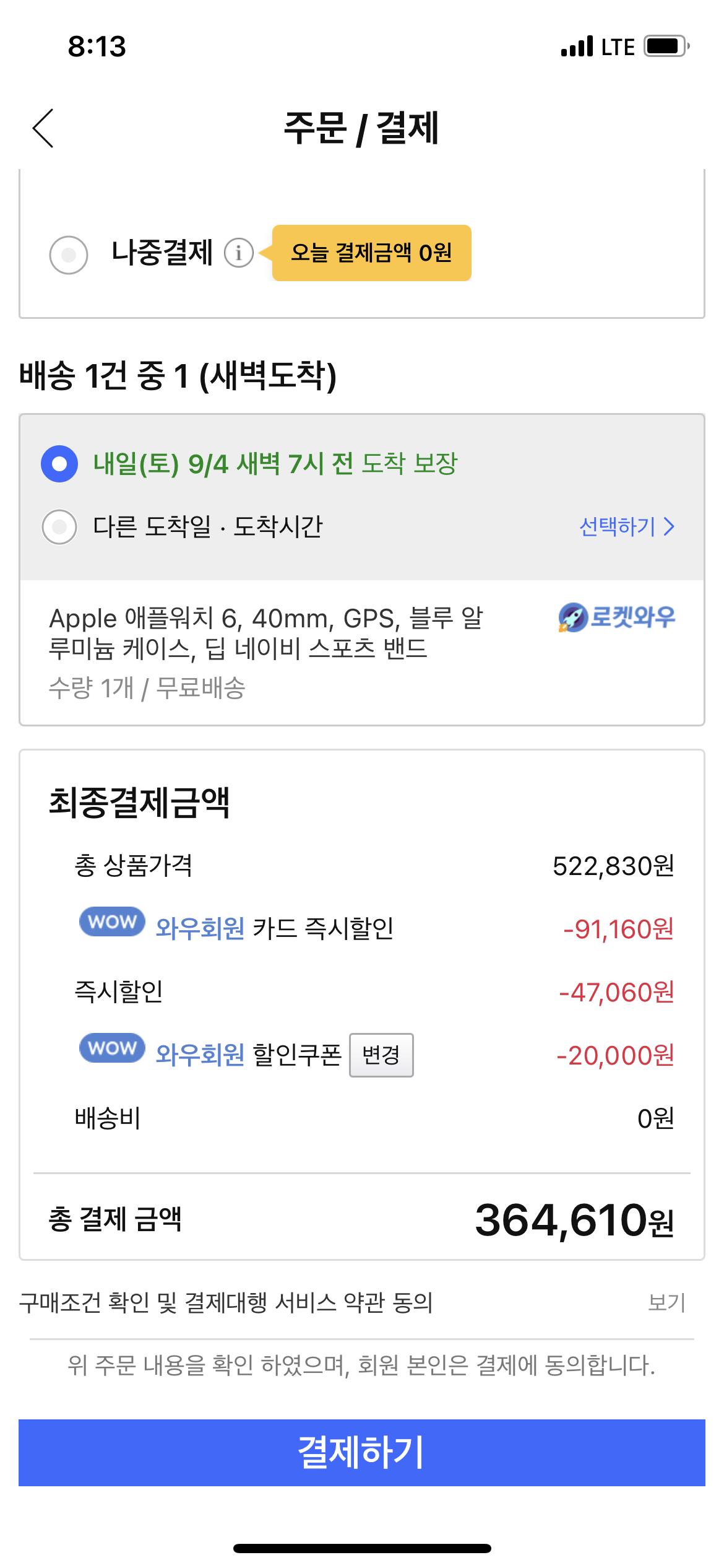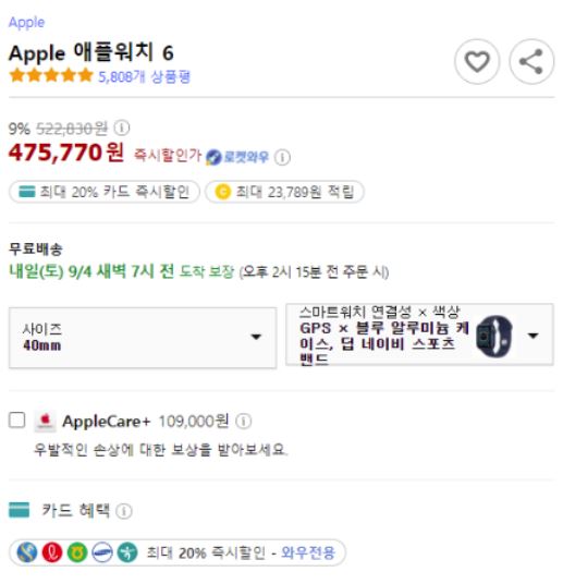 구매가격은 와우회원 할인쿠폰 + 와우회원 카드 20% 추가할인 받아 36만원대에 구매하였습니다. 출시 당시 50만원이 넘는 금액이어서 살 엄두가 안 났지만, 할인해서 애플워치 se 가격대로 구매할 수 있다보니 덥썩 구매하게 되었네요. 또한 애플워치 7가 나온다고 해도 신상품은 비싸니까 그냥 끝물 제품 할인받는 것도 나쁘지 않더라구요.