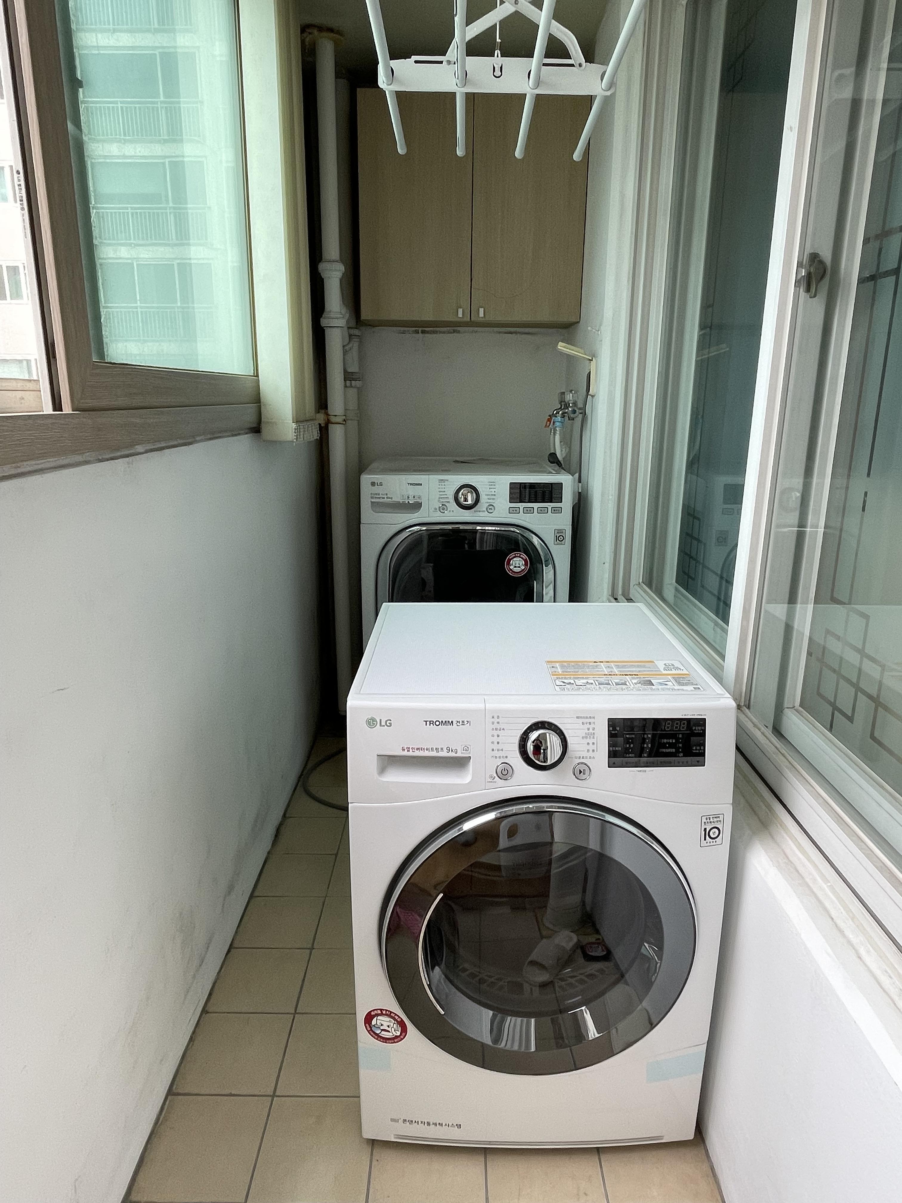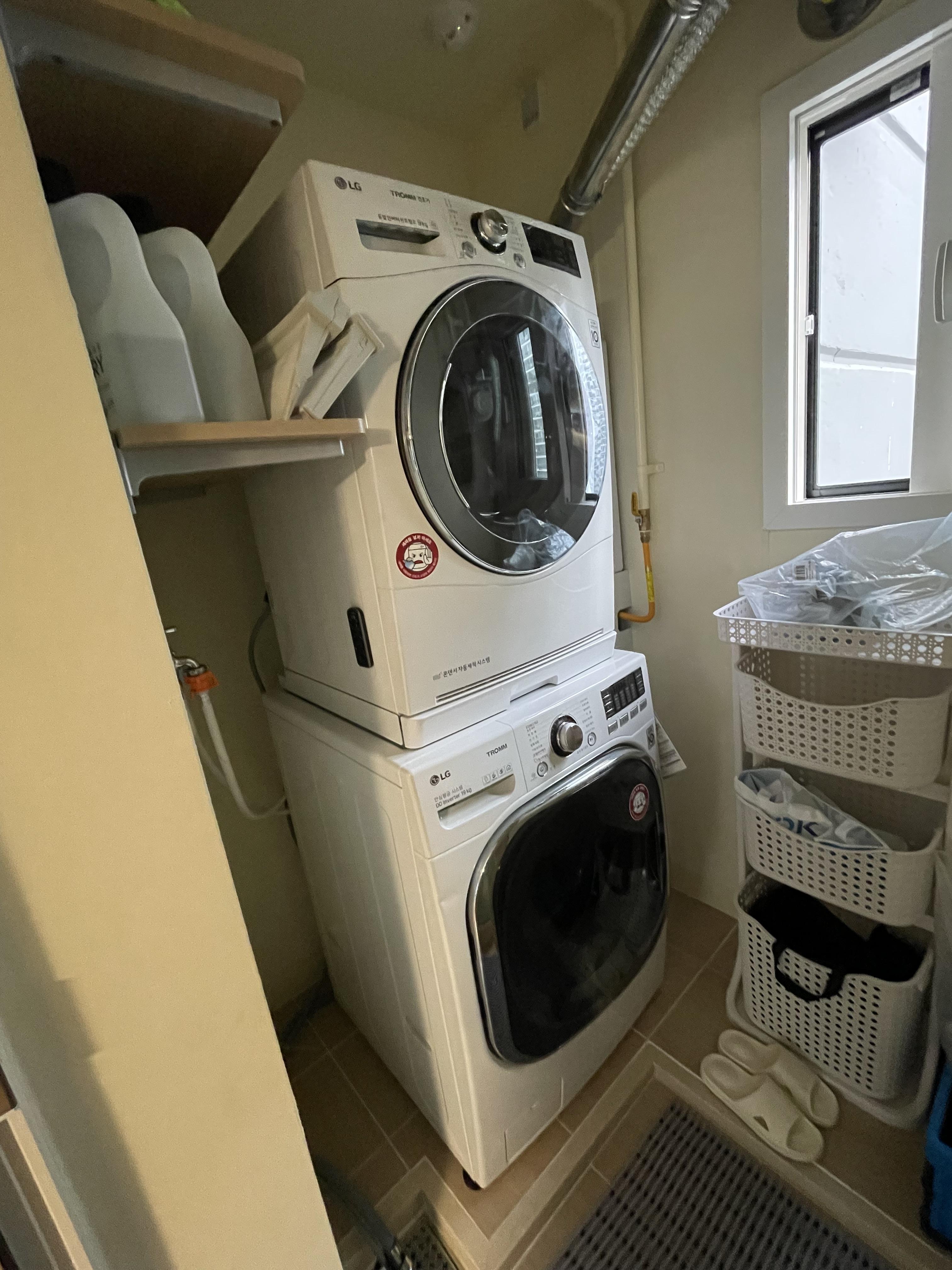이사 전 사용 중인 LG 세탁기, 건조기 모습입니다. 전셋집이다 보니 기물들을 최대한 안 건드리고 싶어서 직렬으로 설치 안 하고 사용했습니다. 세탁 완료 후 건조기로 세탁물을 이동시킬 때 좀 불편하긴 했습니다. LG 전자 세탁기 19kg 모델 + 건조기 9kg 모델입니다. 2018년도에 구입했어요.