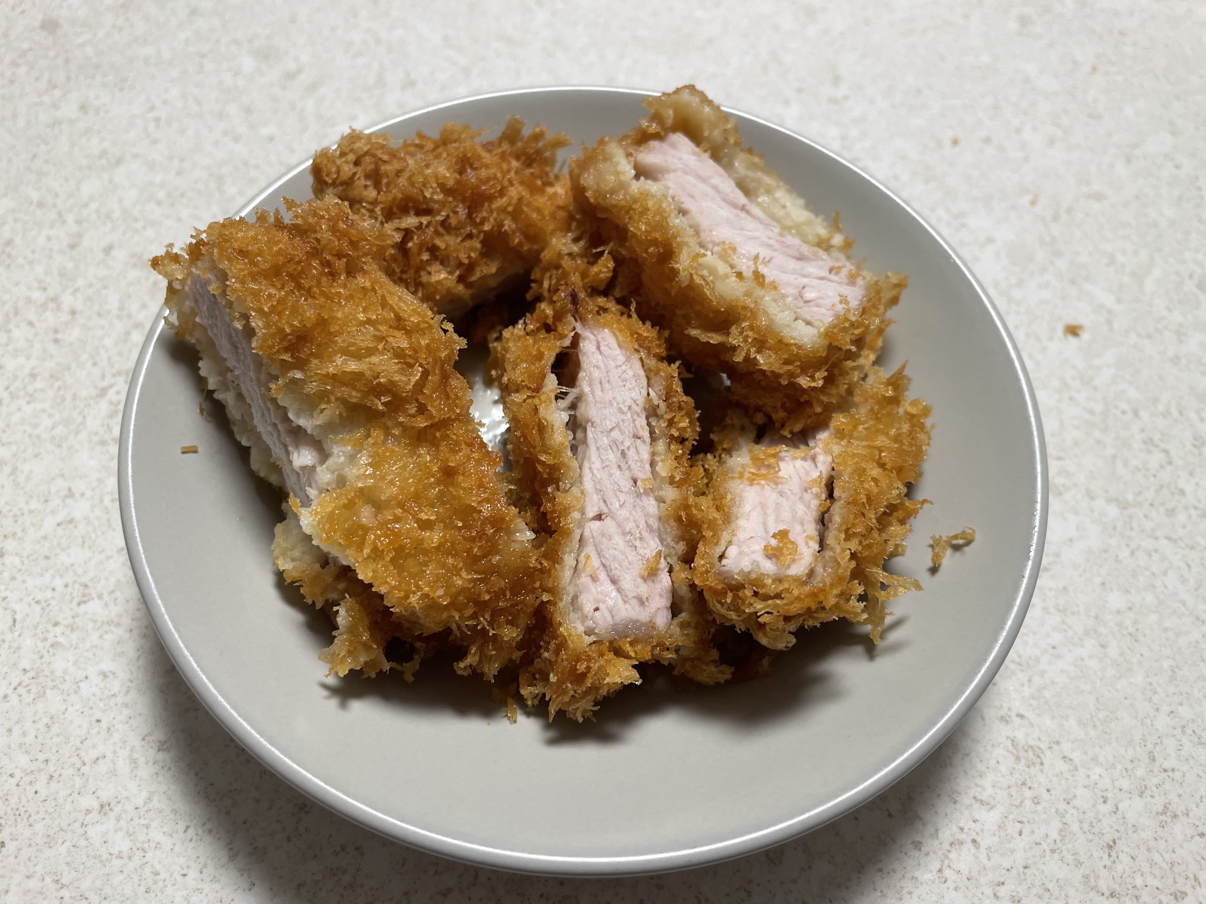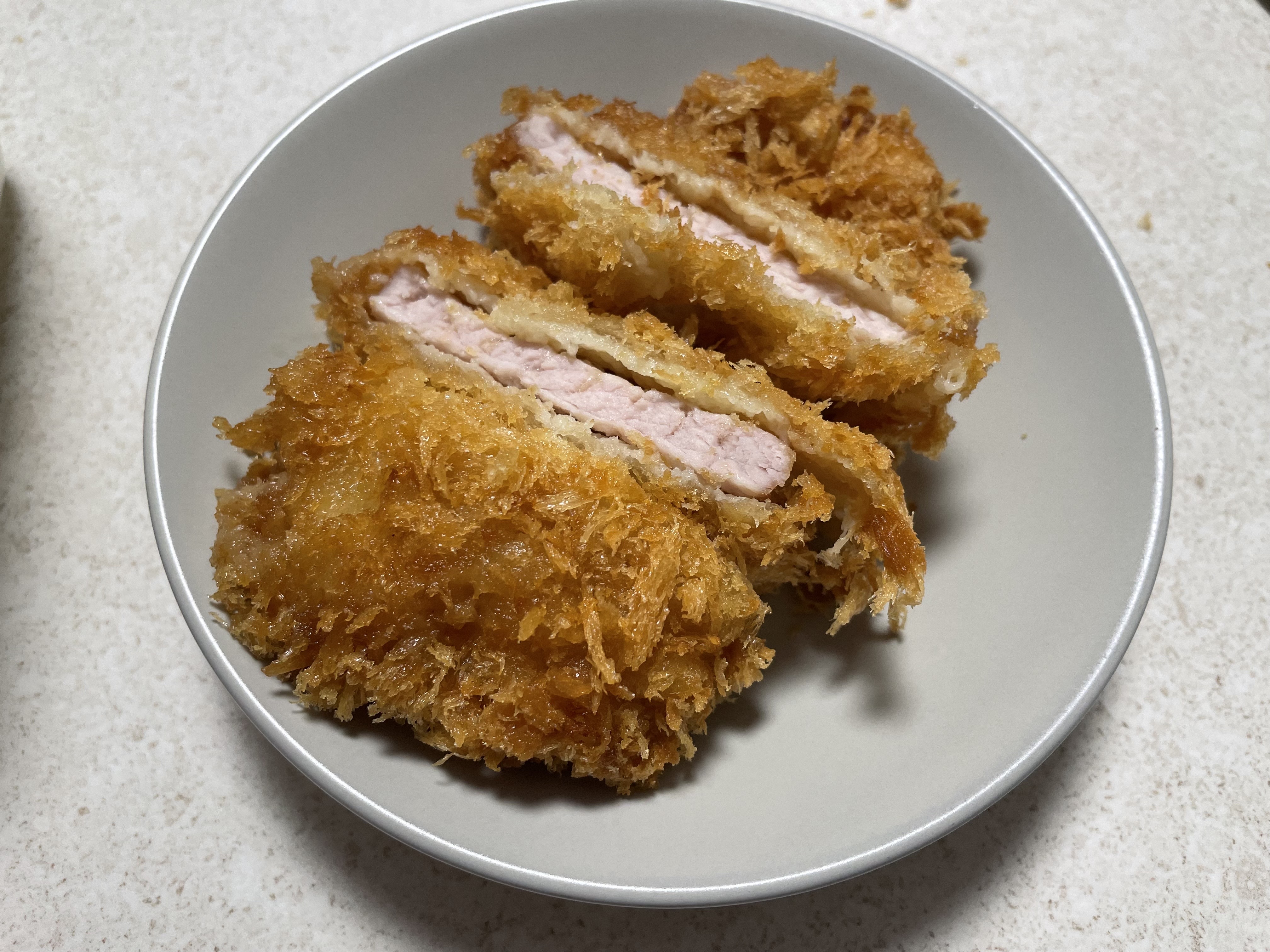 밥도 미리 준비하고 돈까스를 적당한 크기로 잘라봅니다. 돈까스 겉은 바삭바삭 하고 속은 도톰한 게 맘에 들었어요. 크기는 그렇게 크진 않은데 두께가 두껍습니다. 다만 킹박스 세트 기본 제공하는 소스가 좀 모라잤어요.