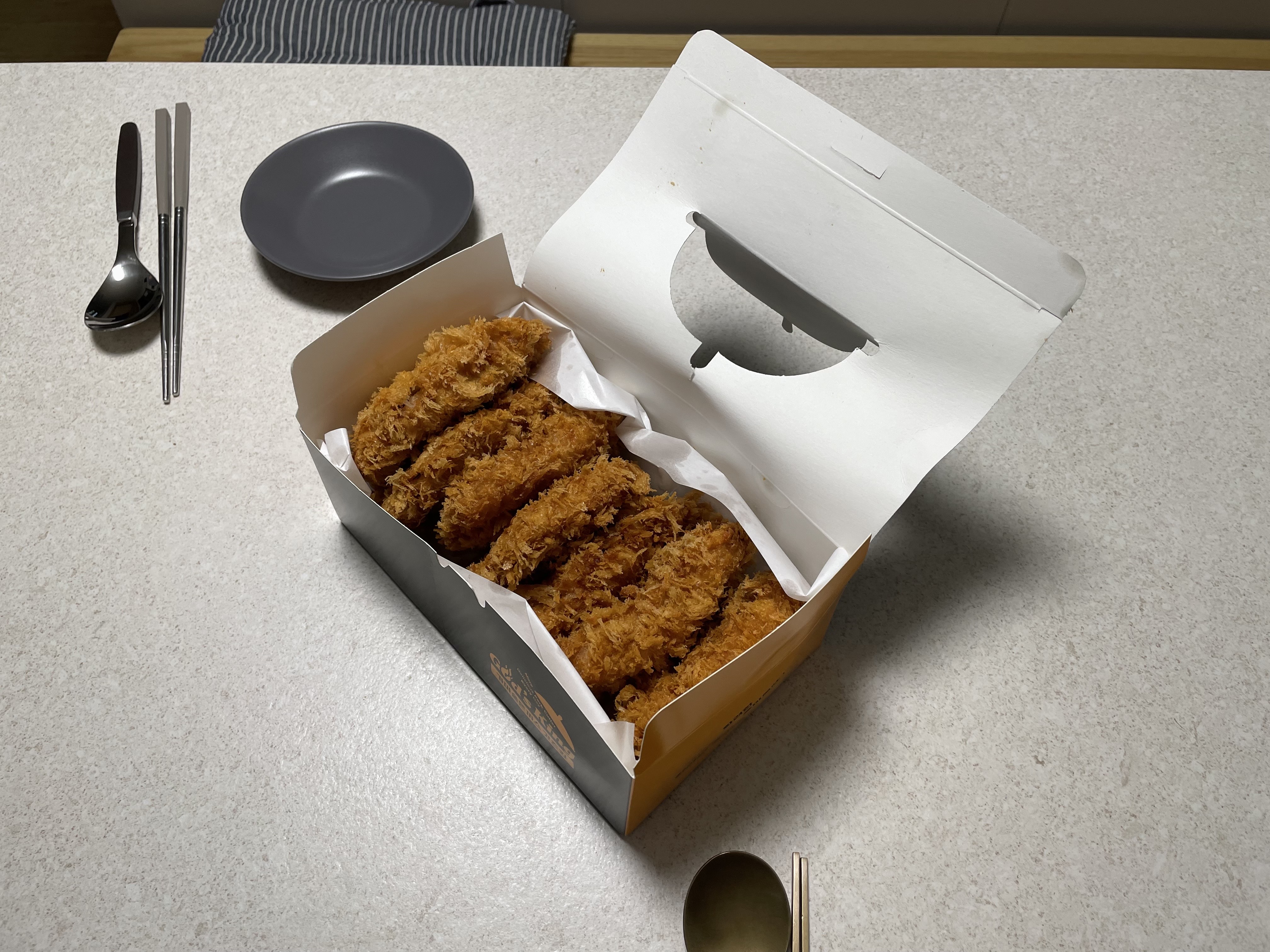 종이박스 포장이고 갓 튀겨나온 돈까스 열기 때문에 종이 박스가 열려 있습니다. 밀폐돼 있으면 뜨거운 열에 눅눅지기 때문이겠죠? 식지 않도록 집으로 달려 갔습니다.