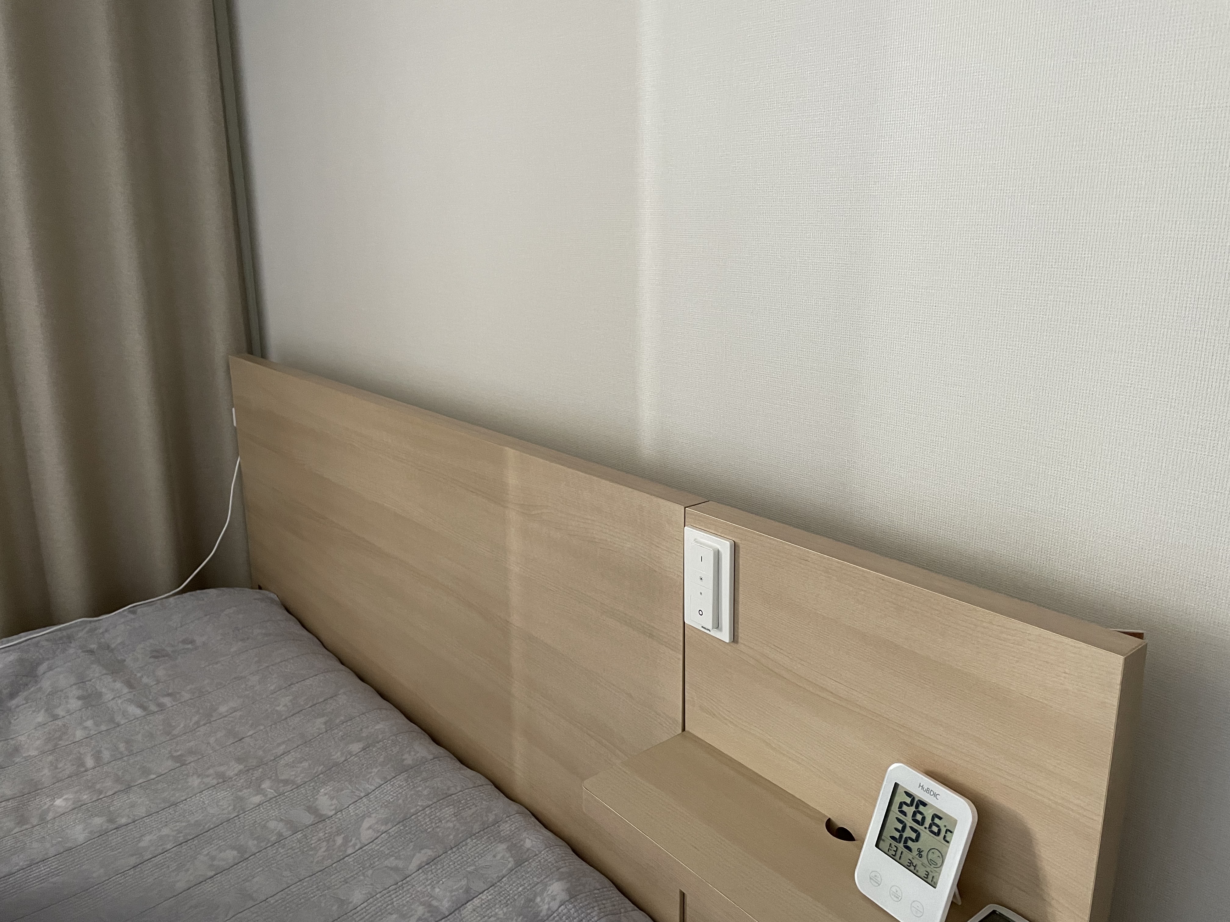 RGB 타입이기 때문에 다양한 색상 연출이 가능하나 아무래도 침실은 따뜻한 느낌의 전구색이 좋죠. 필립스휴 앱을 이용해 조명의 색상과 밝기를 자유자재로 조절할 수 있기 때문에 편안한 수면환경을 만들 수 있습니다. 추가로 필립스휴 전용 악세사리 디머스위치(dimmer switch)까지 협탁에 설치 하였습니다. 아무래도 조명 제어를 할 때 직관적은 스위치 타입이 편하기 때문입니다. 어두운 밤에 일어나서 스마트폰을 찾아 앱을 열고 조명을 켜긴 상당히 불편하기 때문이죠.