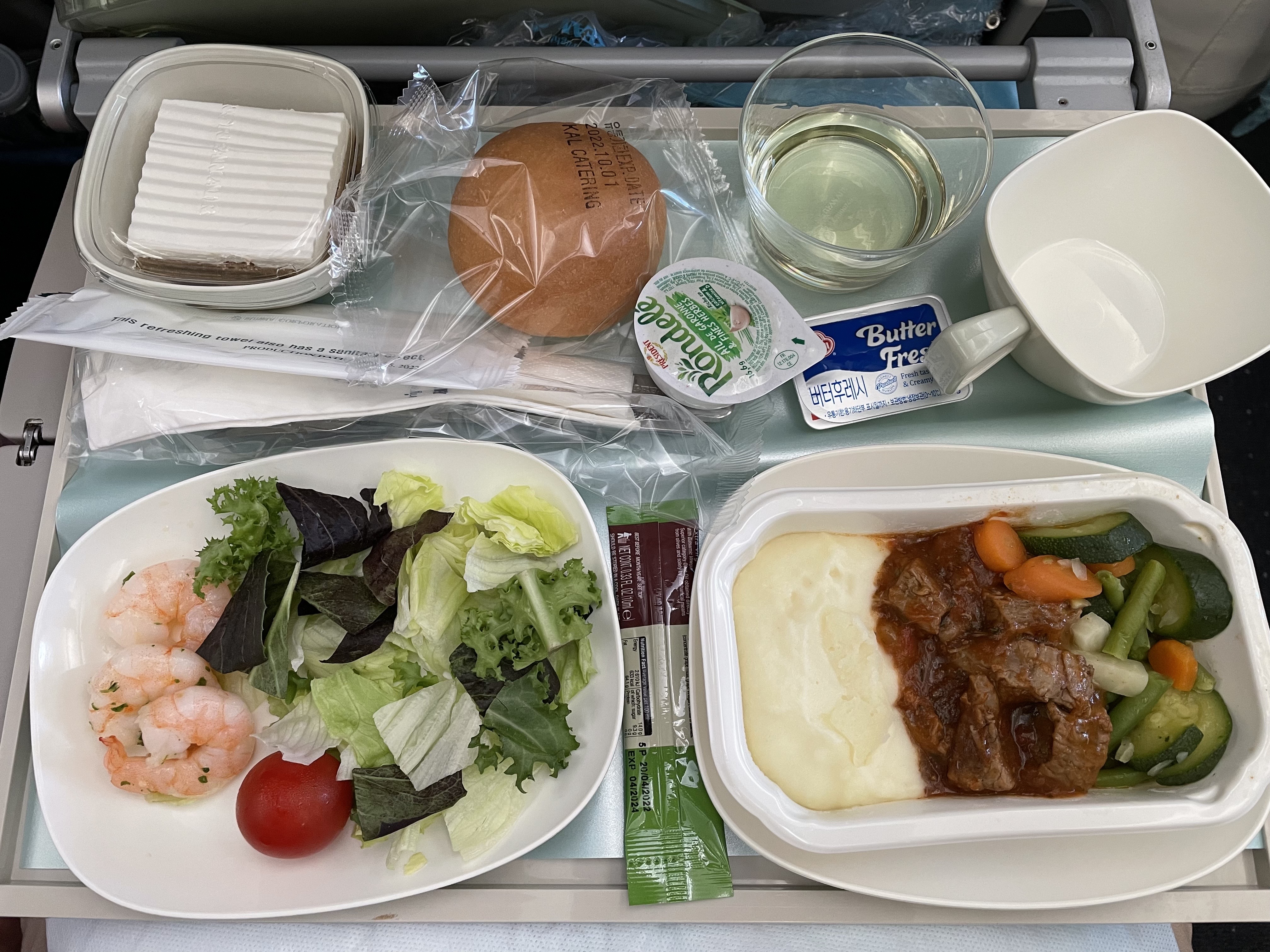 첫번재 기내식은 이륙하여 순항고도에 도달하자 서빙을 시작합니다. 소고기와 메쉬 포테이토 그리고 샐러드 입니다. 음료는 와인과 탄산음료, 주스, 커피, 맥주 등 입니다. 음료 리필도 가능합니다.