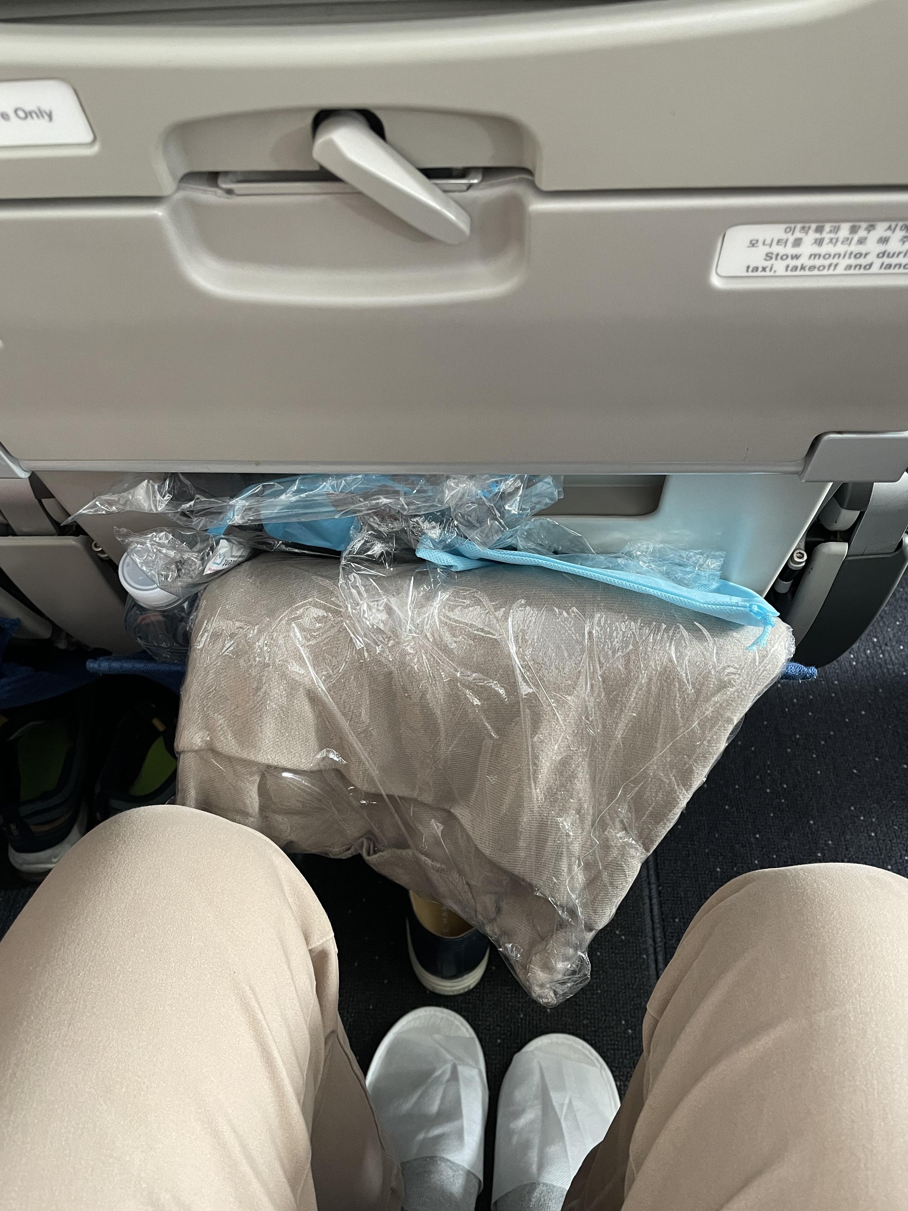 수면 안대는 승무원에게 별도로 요청해야 갖다 주더라구요. 장시간 비행이기 때문에 기내용 목베개도 별도로 가져 갔는데 좌석 머리받침대(헤드레스트) 조절이 잘 되어 오히려 짐이 되어 불필요 했습니다. 건장한 성인 남성 탑승 시 레그룸은 아래 사진과 같습니다.