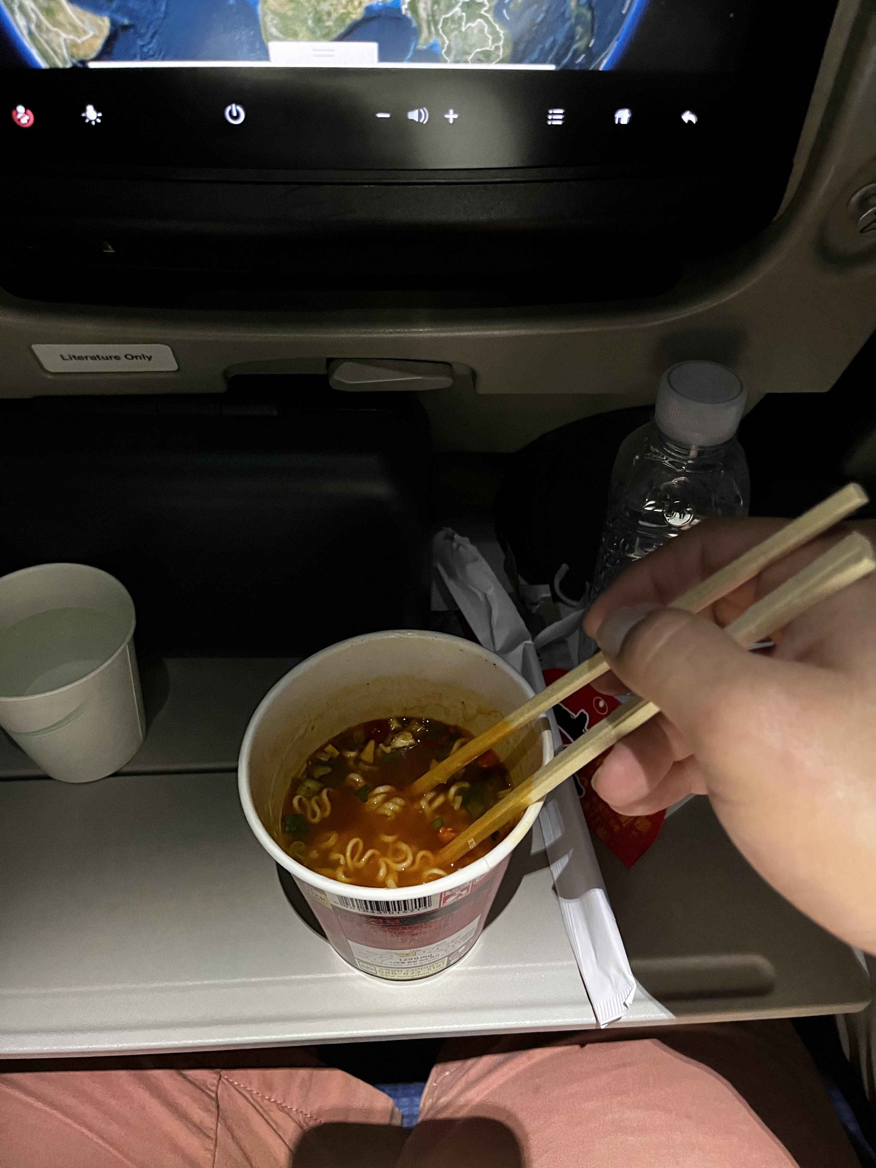 기내식 나오는 타임 말고 출출하시다면 승무원에게 요청하여 컵라면도 받으실 수 있습니다. 어느 순간부터 라면 냄새가 나기 시작하더니 많은 분들이 라면을 드시고 계시더라구요. 기내식 나오기 전에 간식으로 주먹밥도 나왔었습니다.