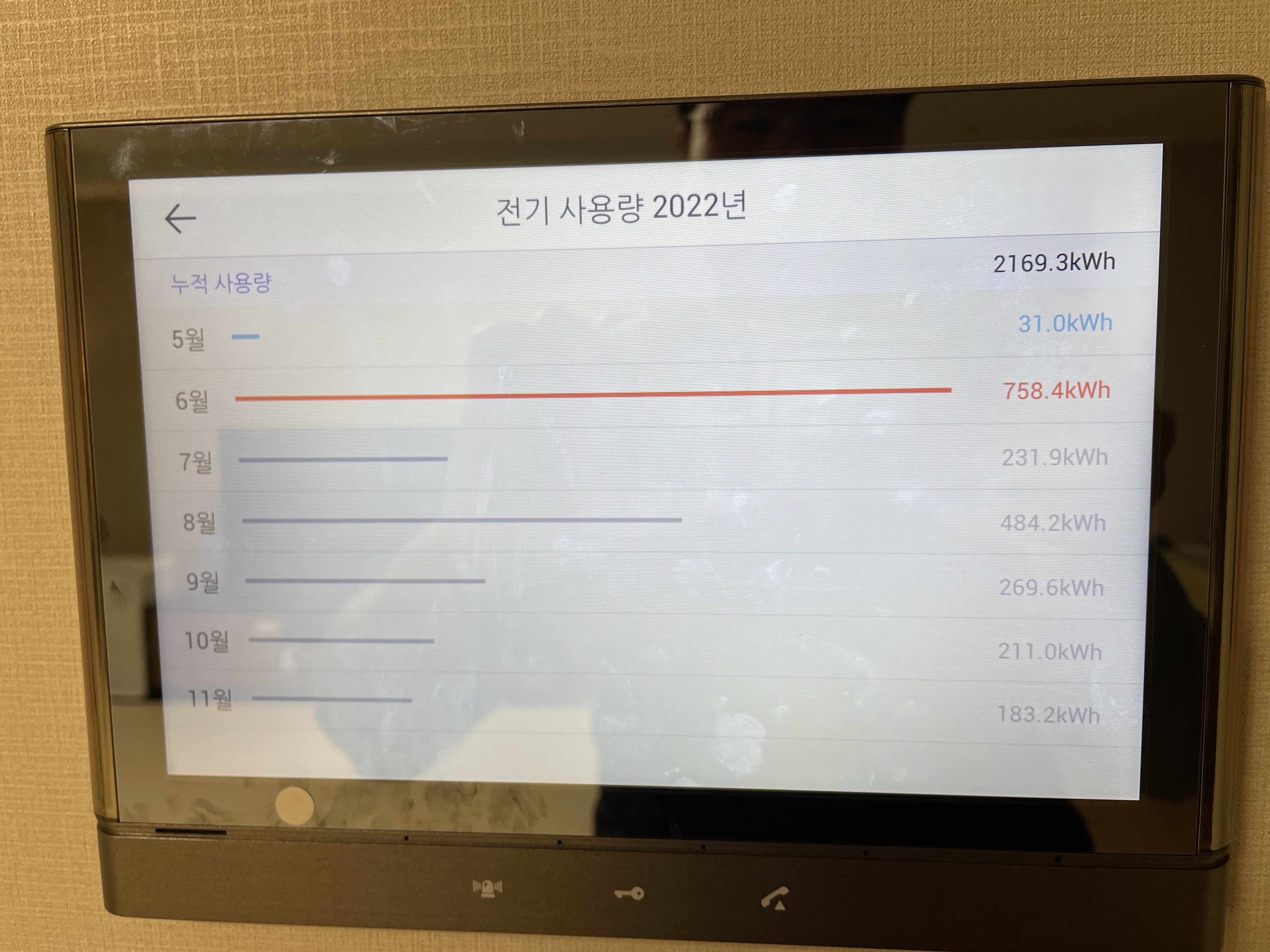 그래서 저같은 경우 아파트 세대 내 설치된 월패드로 사용전력량을 모니터링 하고 있습니다.(월패드 1달 단위 검침량과 요금 고지서의 검침 기간은 물론 다를 수 있습니다)