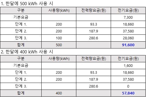 위 전기요금표 기준(주택용 전력-저압)에 맞춰 요금을 한번 계산해 보겠습니다.(부가가치세 등은 제외)