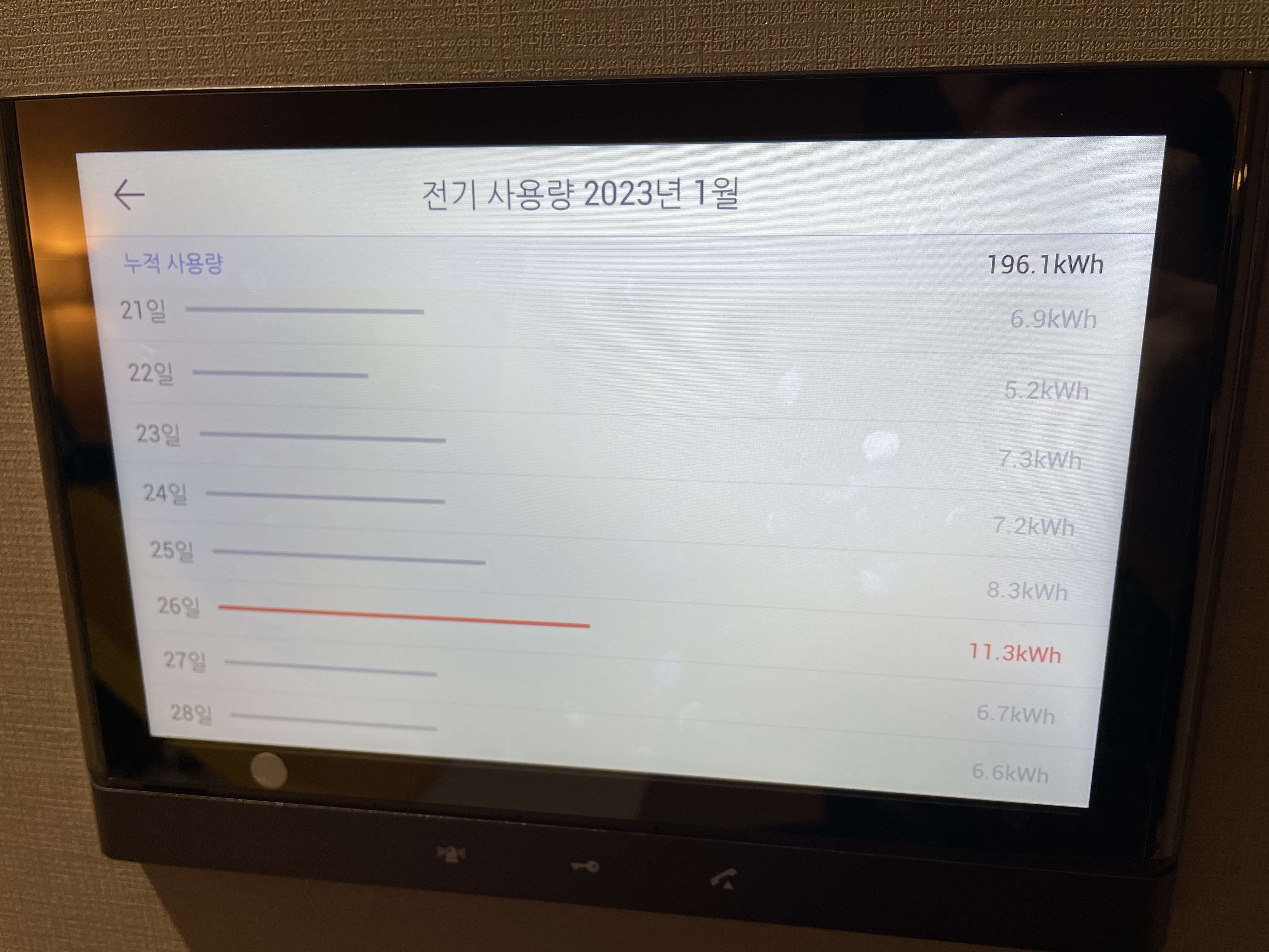 전기요금은 누진제이기 때문에 전기 사용량 구간마다 요금이 더 비싸진다는 점이 있습니다. 월패드로 전기 사용량을 모니터링 하면서 누진 구간을 넘지 않도록 생활 습관을 바꿀 수 있습니다. 가정용 전기는 한달 400kWh 이상 사용하면 전력량 요금이 대폭 상승하기 때문에 에어컨을 사용하는 여름을 제외하고는 400kWh 이하 유지하는 게 좋습니다.