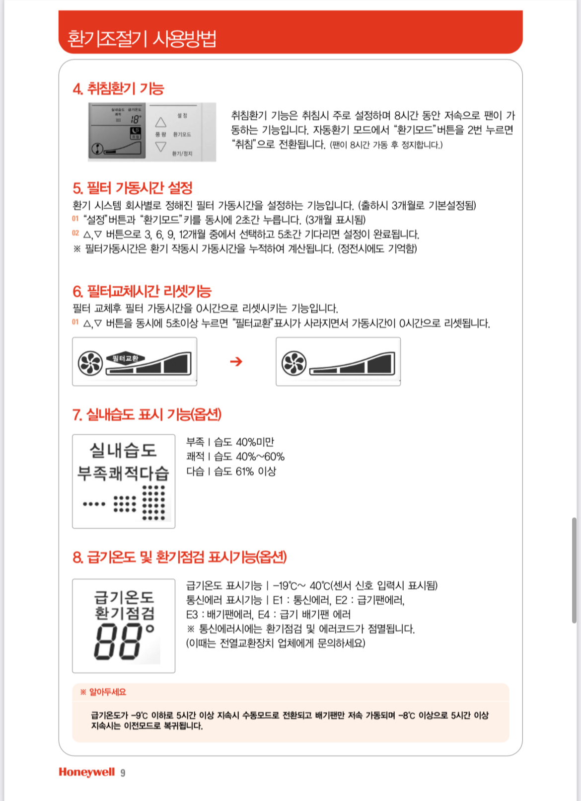 이 온도조절기 모델명이 DT300-V인 것으로 확인 했습니다. 아래 매뉴얼에 보니 6번 안내에 따라 리셋하면 됩니다. 환기조절기 풍량 +, - 상하 버튼을 동시에 5초 누르면 리셋됩니다. 리셋기능 외 필터 알림 기간까지도 설정할 수 있네요.
