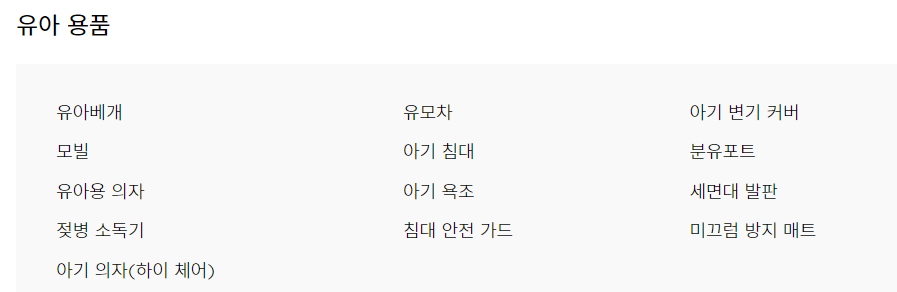 베개, 유모차, 변기커버, 모빌, 아기 침대, 분유포트, 아기의자, 아기욕조, 발판,