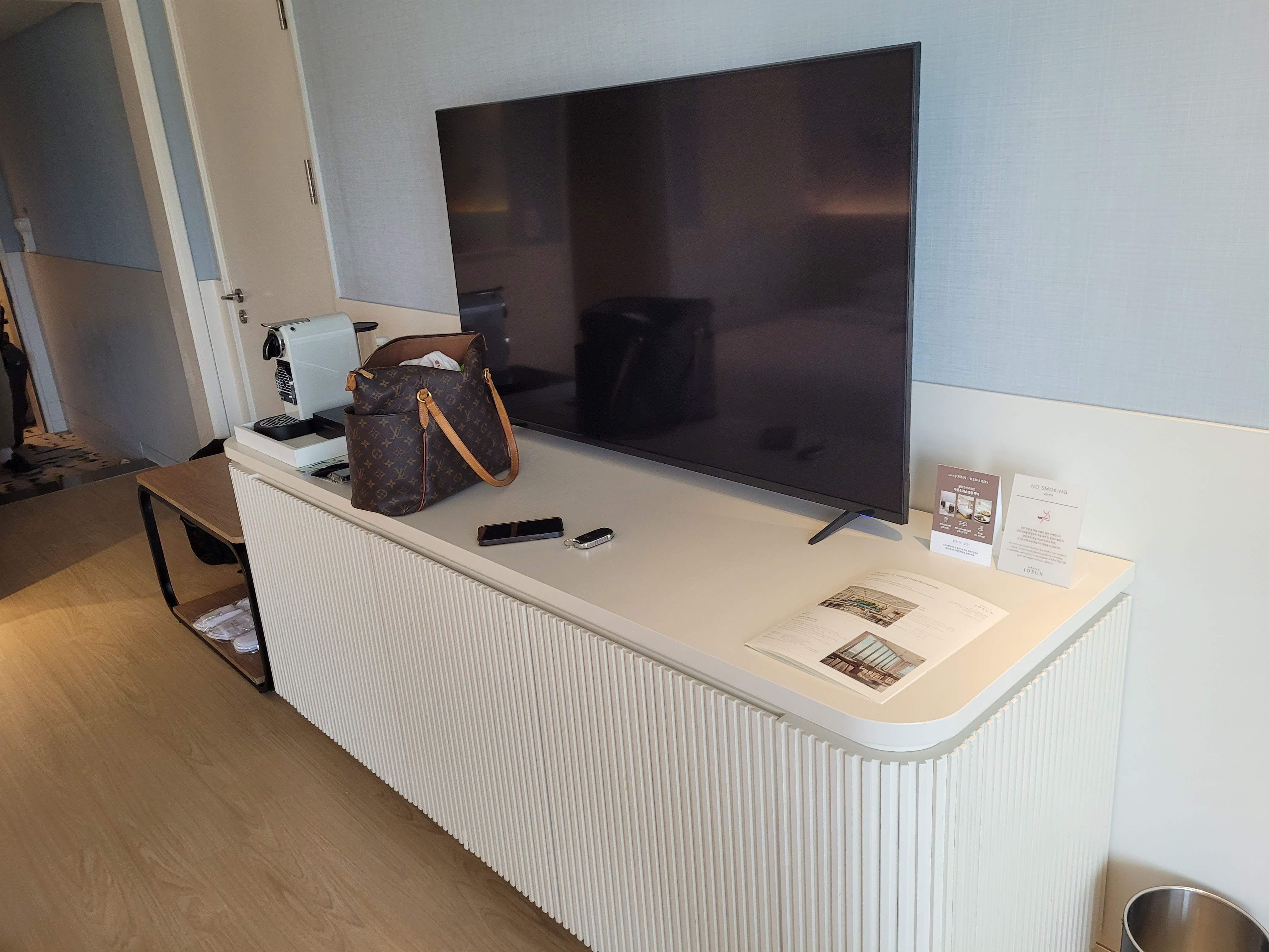 티비 아래에 냉장고와 물품들이 준비되어 있어요.