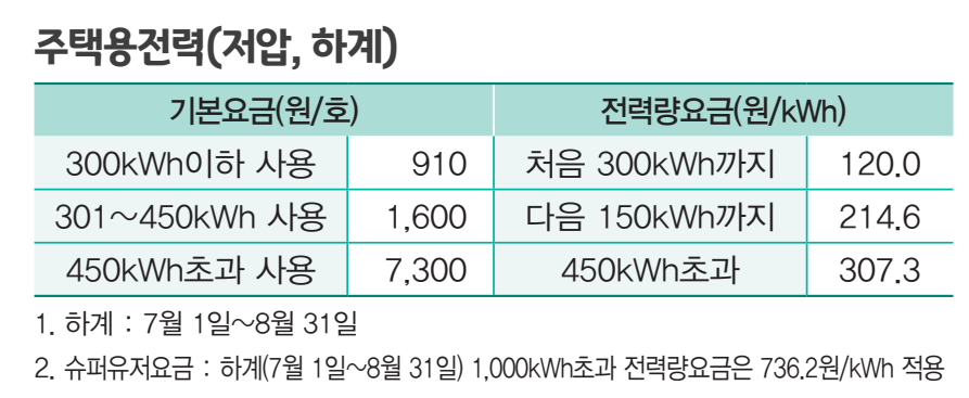 최근 전기요금이 급격하게 오르고 있습니다. 하계 기간에는 에어컨을 많이 사용하게 됩니다. 가정용 전기요금은 누진제를 적용 받기 때문에 계획 없이 사용하다가 전기요금 폭탄을 맞을 수도 있습니다. 여름철에 왜 월 전기사용량 450kWh까지 사용하면 좋은 이유에 대해 알아보도록 하겠습니다.