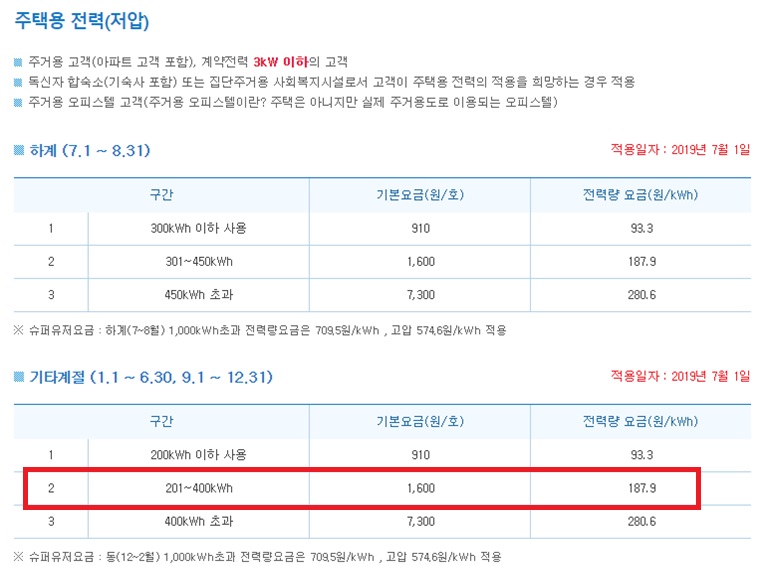 전력량 요금은 아래와 같이 kWh당 187.9원을 적용하였습니다. 우리나라는 전기요금체계가 누진제이기 때문에 전력사용량이 많은 가정은 더 아낄 수 있겠죠? 또한 조명을 더 많이, 더 오래 사용하는 곳일수록 절약 금액도 커집니다.