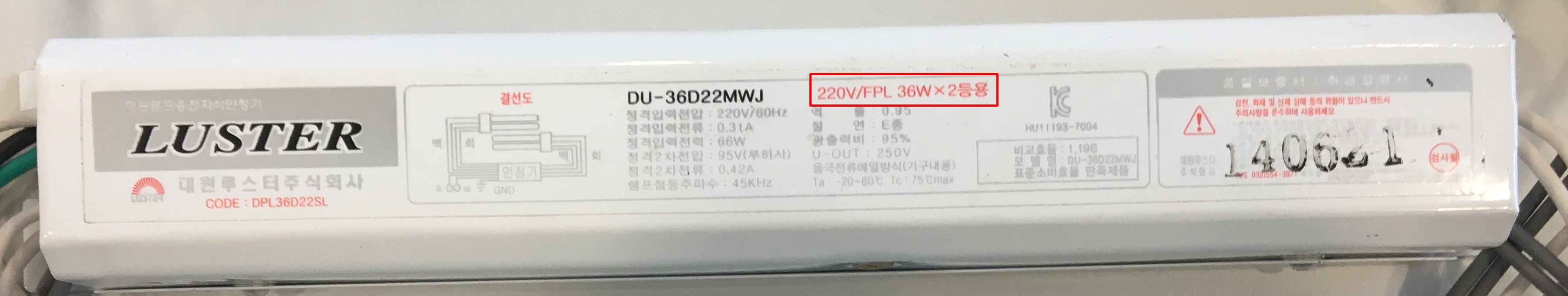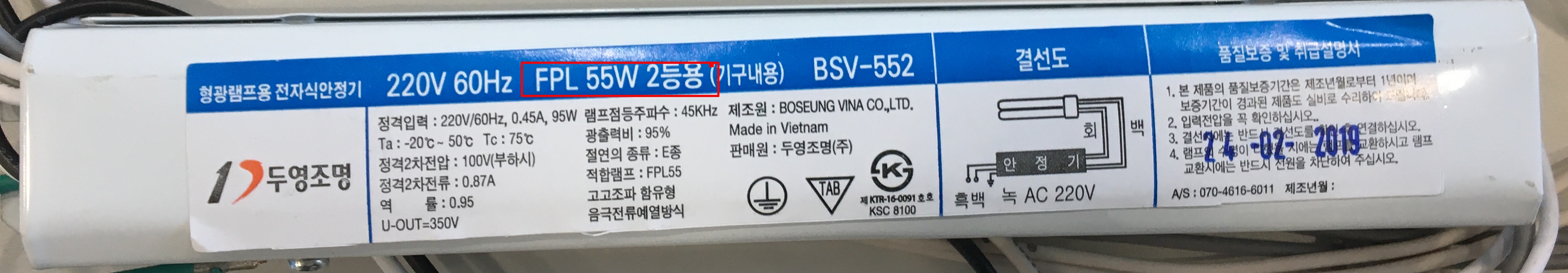 아래 사진의 빨간 네모 표시를 보시면 어떤 규격의 안정기임을 확인할 수 있습니다.