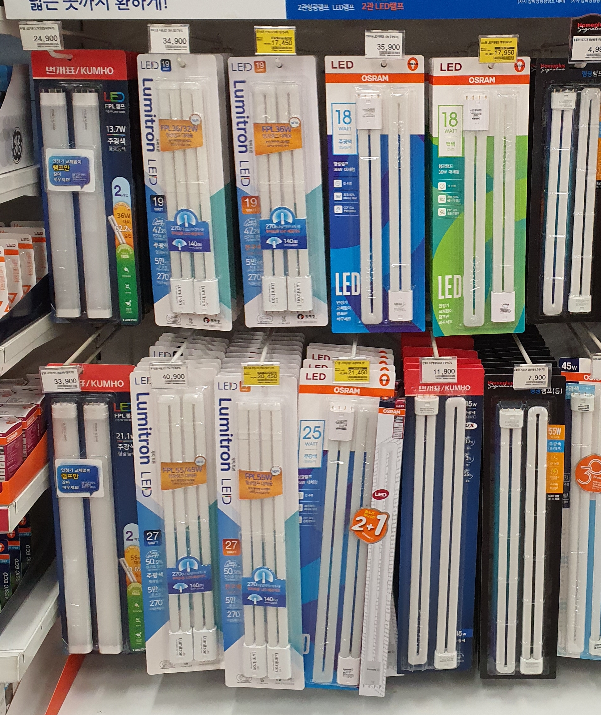 시중에 판매하는 형광램프 대체형 LED 램프는 FPL or PL 36/55W 형광램프를 대체하는 제품입니다. 36W/55W는 아파트 등 우리나라 대부분의 가정(거실, 방)에서 사용하는 조명입니다.