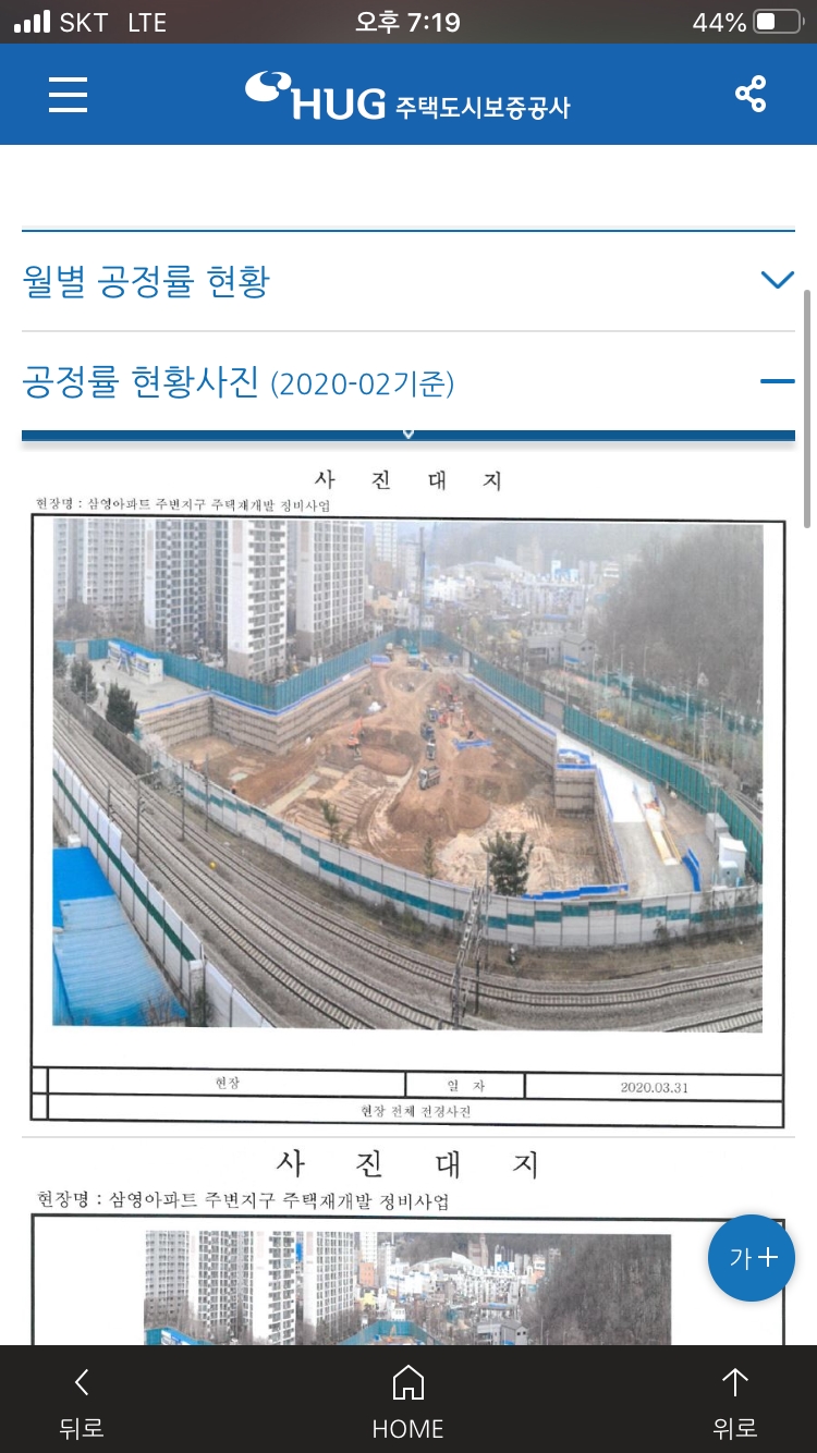 하지만 아파트 공사 현장에 직접 가지않고 아파트 공정률을 스마트폰으로 아주 간단하게 확인할 수 있는 방법이 있어요. 현장사진도 업로드 되어있는 것을 볼 수도 있고요. 그건 바로 분양보증을 받은 아파트 사업장의 공사진행 정보를 주택도시보증공사 모바일 어플리케이션(HUG-i)를 통해 확인할 수 있습니다.