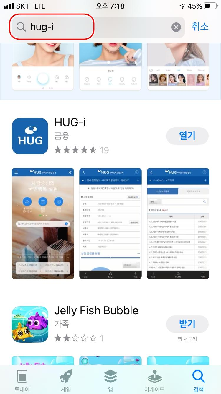1. 앱을 다운받으시려면 애플 앱스토어 & 구글 플레이스토어에서 'HUG-i' 를 검색해 주세요.