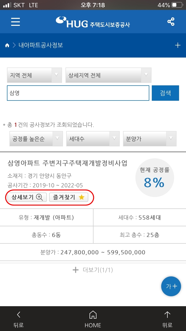 4. '상세보기'로 들어가면 사업에 대한 기본적인 정보와 최근 공정률을 확인할 수 있습니다. 사업장을 즐겨찾기도 할 수 있으니 즐겨찾기 해 놓으면 나중에 쉽게 확인할 수 있습니다.